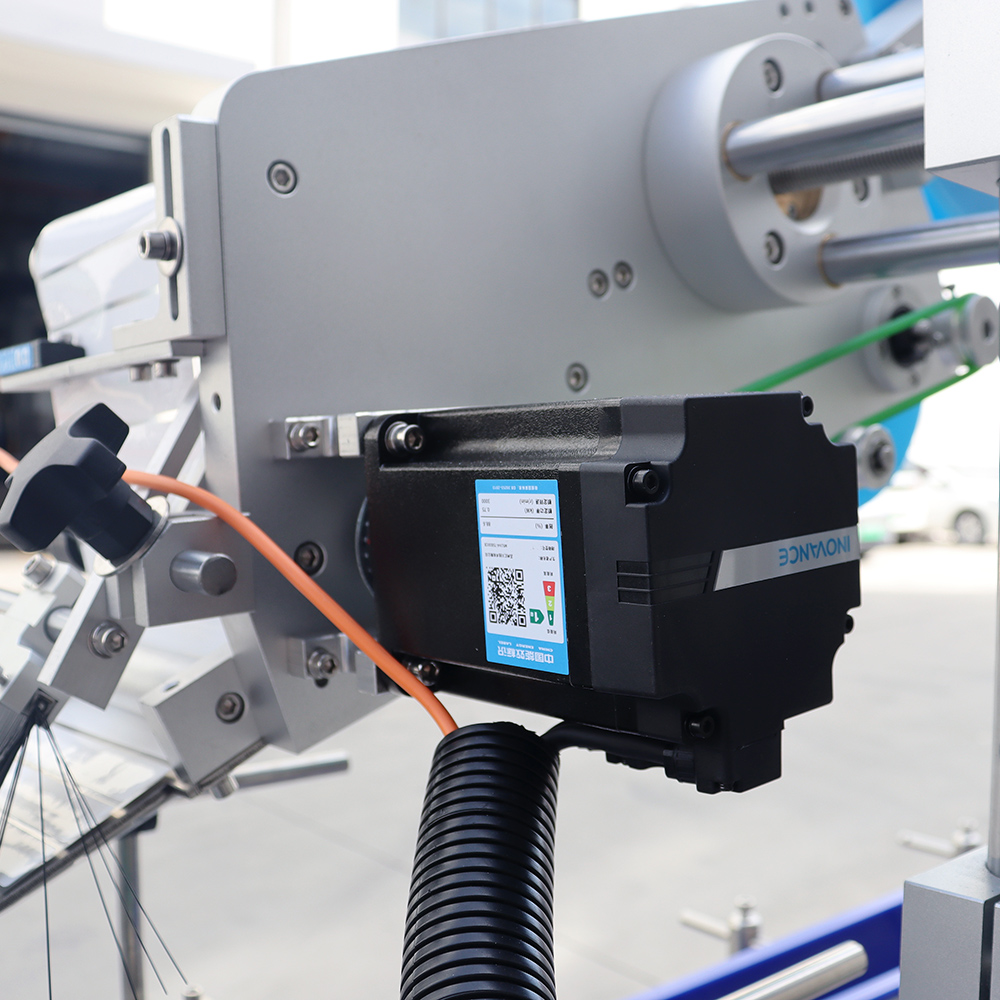 During operation, bottles enter the conveyor and are stabilized by adjustable guide rails and pressing devices. Sensors detect bottle presence and trigger precise label dispensing. The adhesive label is applied smoothly onto the flat surface and pressed firmly to ensure strong adhesion and accurate positioning.
