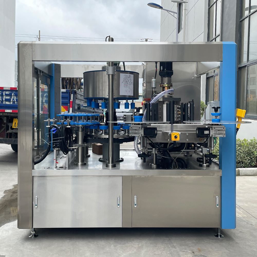 The machine’s rotary design and quick-adjust mechanisms allow rapid changeovers between different bottle formats, reducing downtime and simplifying production setup for diverse product runs.